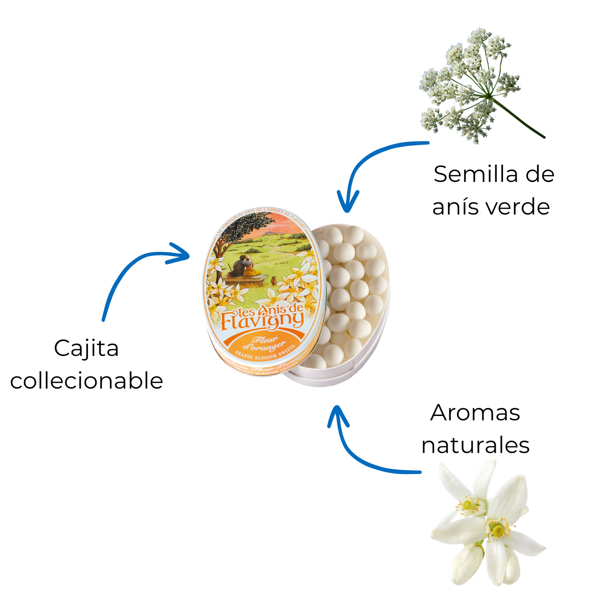 Descubre el sabor único de los anís de Flavigny, hechos con semillas de anís y cubiertos de un jarabe de azúcar de sabor natural. ¡Atrévete a probar estas bolitas divinas! Los dulces siguen fabricados en la abadía Saint-Pierre en Flavigny-sur-Ozerain. El dibujo sobre la cajita representa un pastor y una pastora enamorados ya que las grageas se ofrecían para celebrar el amor y la fecundidad...