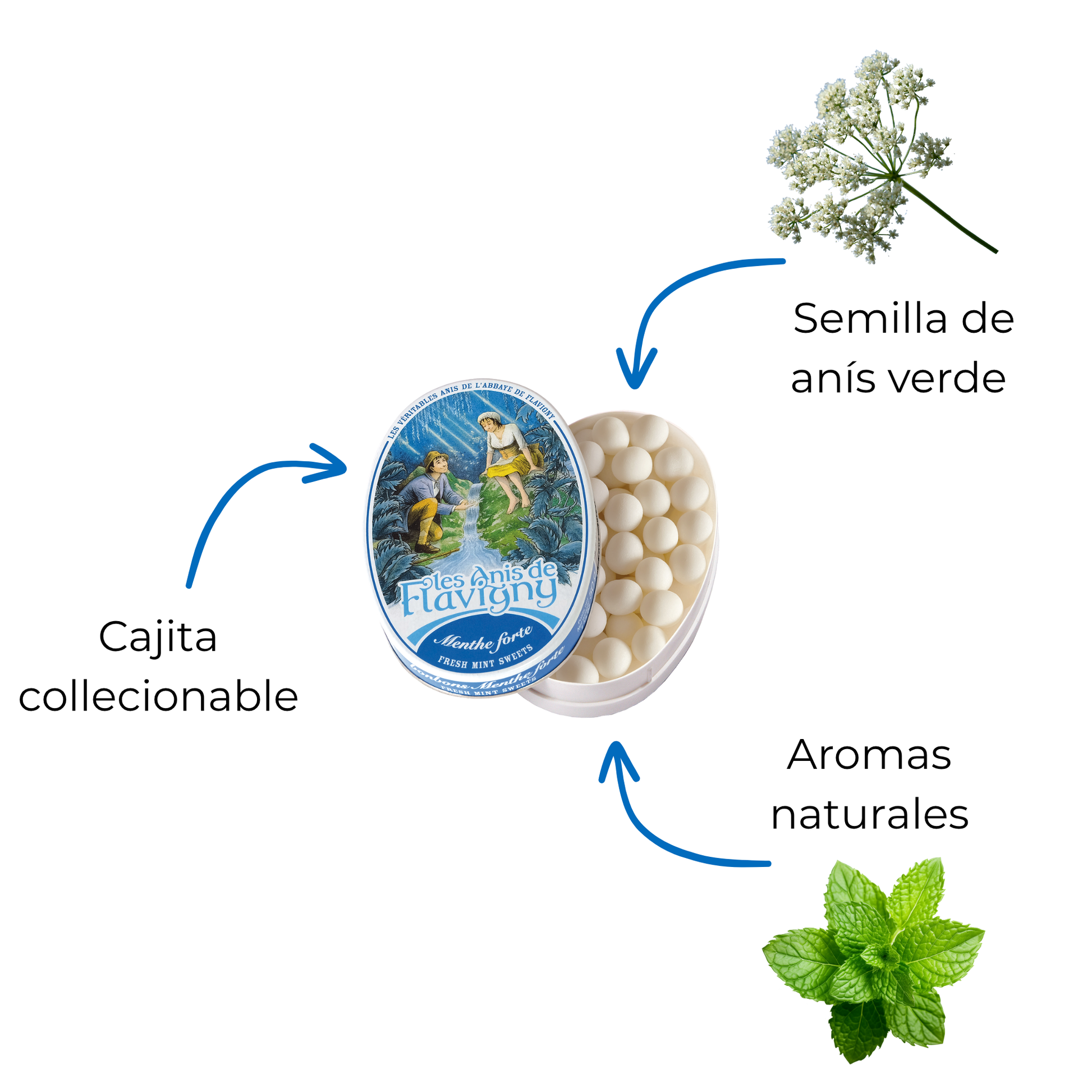 Descubre el sabor único de los anís de Flavigny, hechos con semillas de anís y cubiertos de un jarabe de azúcar de sabor natural. ¡Atrévete a probar estas bolitas divinas! Los dulces siguen fabricados en la abadía Saint-Pierre en Flavigny-sur-Ozerain. El dibujo sobre la cajita representa un pastor y una pastora enamorados ya que las grageas se ofrecían para celebrar el amor y la fecundidad...