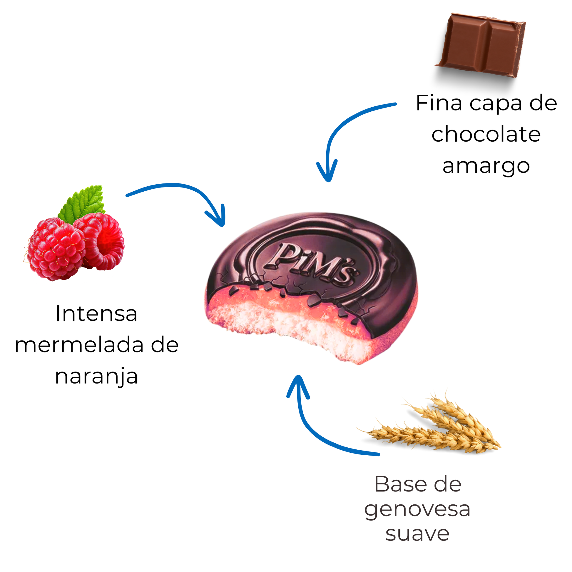 1 Pim’s de FrambuesaSuave bizcocho con mermelada de frambuesa y cobertura de chocolate amargo