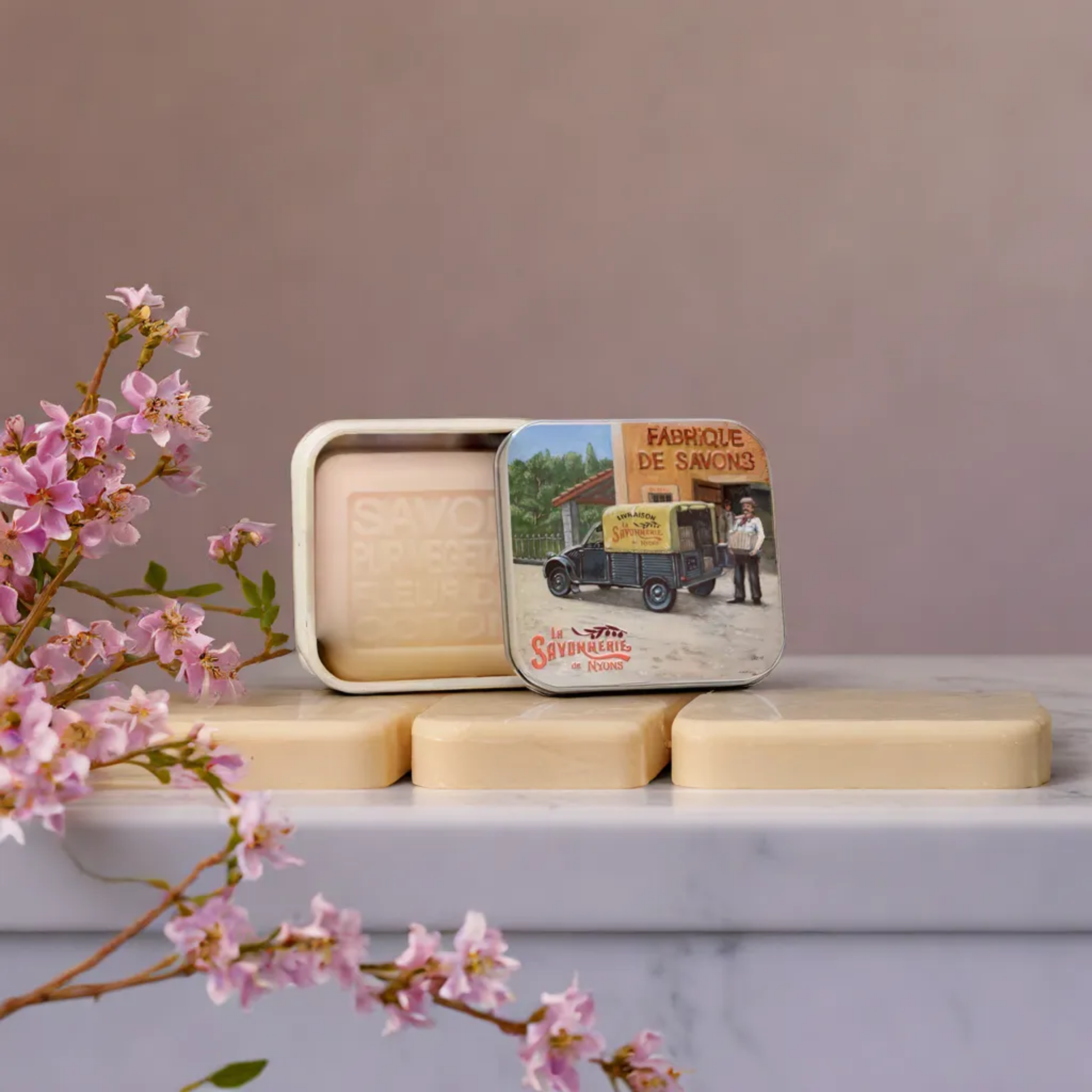 El savoir-faire ancestral y la riqueza del territorio de Provenza, en el Sur de Francia, permiten a la Savonnerie de Nyons de imaginar y fabricar jabones de alta calidad. Este jabón de flor de algodón viene en una bonita caja metálica vintage de los años 30. ¡Ideal para un regalo!