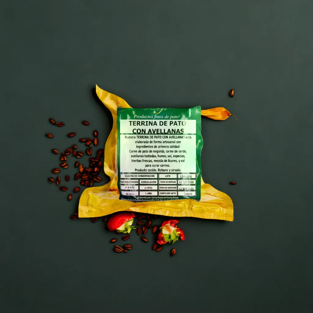 Ingredientes: carne de pato engorda, carne de cerdo, avellanas tostadas, huevo, sal, especias, hierbas frescas, mezcla de licores, sal para curar carnes
