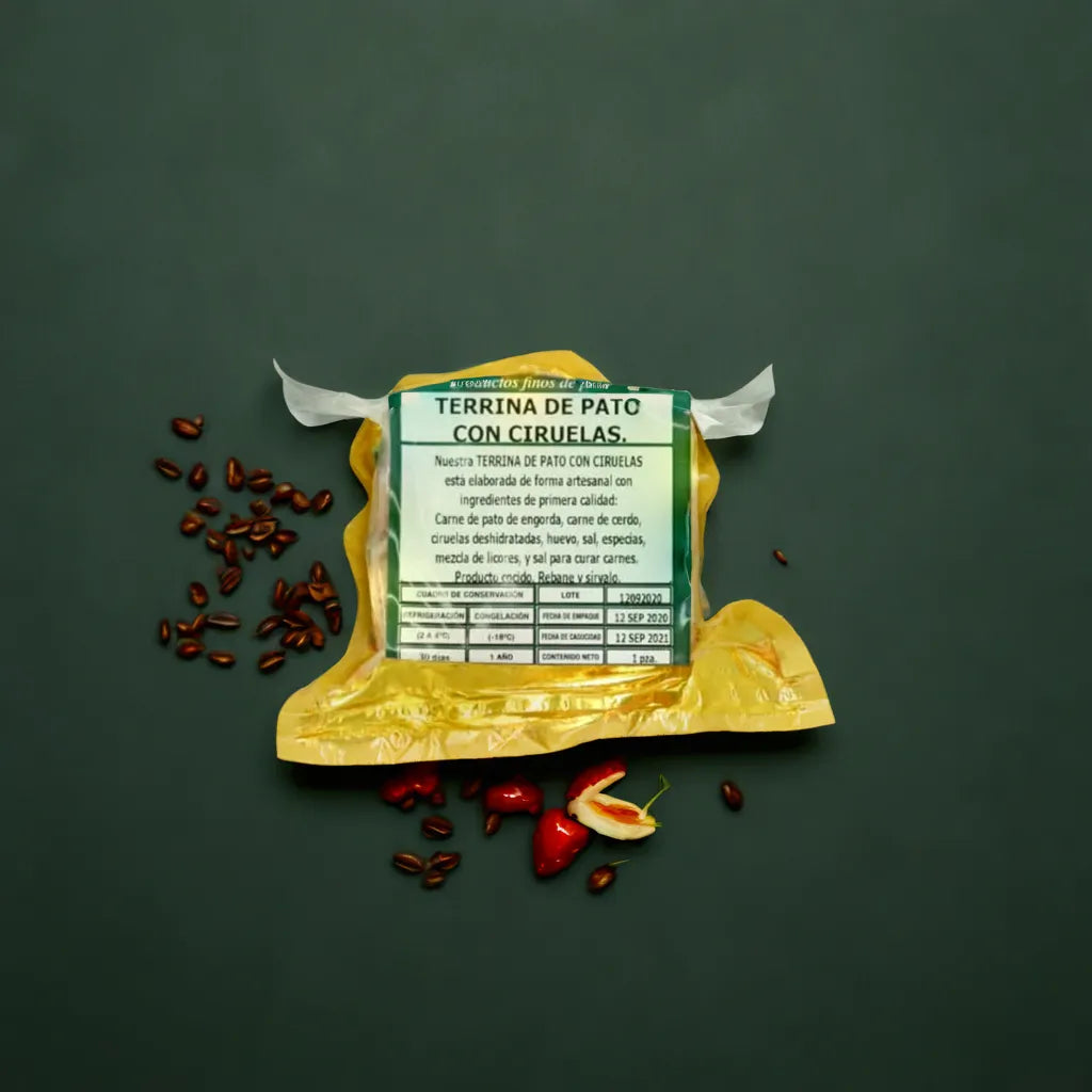 Ingredientes: carne de pato engorda, carne de cerdo, ciruelas deshidratadas, huevo, sal, especias, mezcla de licores, sal para curar carnes